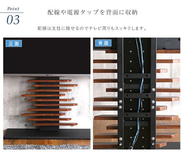お部屋のインテリアに合わせやすいオシャレな飾り板がアクセントになります。最大100インチの大型テレビにもしっかり対応し、省スペースで設置できるのもポイントです。配線や電源コードを隠せるスッキリとした構造で、お部屋をすっきりと演出します。さらに、高さは5段階調整可能なので、お好みの視聴高さに合わせて調整できます。