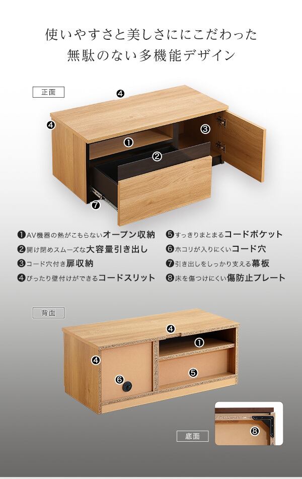 日本製のテレビ台、テレビボードが新登場!この90cm幅のテレビボードは、国産ならではの精巧な作りで美しさと高級感が魅力です。収納部分には大容量の引き出し収納と扉収納が付いており、テレビ周りの小物やDVD、リモコンなどがスッキリ収納できます。さらに、背面部分にはコード収納スペースも備えられているので、スッキリとした空間を演出できます。