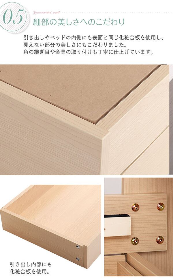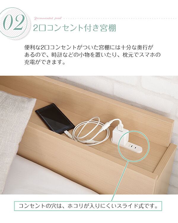 忙しい朝に便利な収納スペースで、ベッド周りがすっきり片付きます。宮棚には、スマートフォンやタブレットなどを置くことも可能。さらに、2口コンセント付きで、スマートに電気器具を充電することもできます。抗菌・防臭機能も搭載しているので、いつでも清潔な環境を保つことができます。