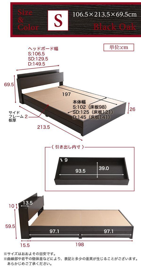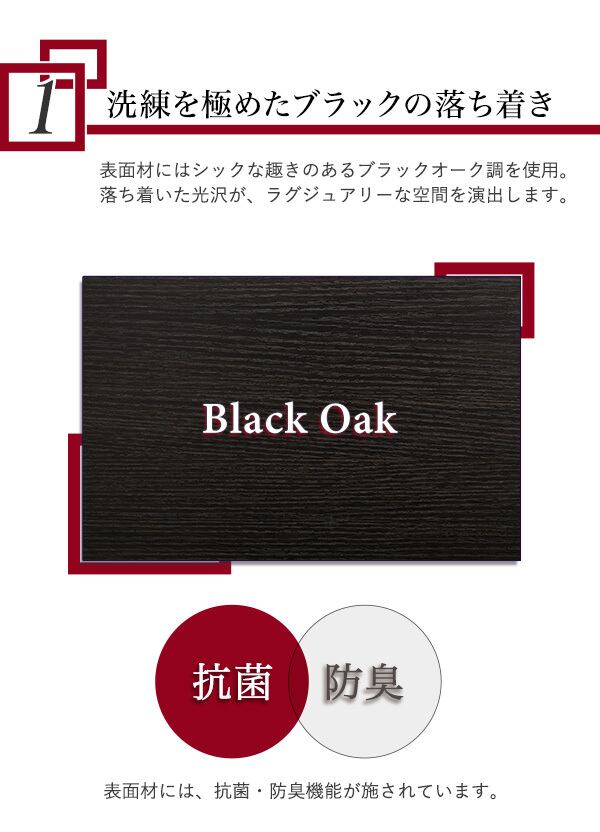 この収納付きデザインベッドは、機能性とスタイリッシュさを兼ね備えたシングルサイズの贅沢なベッドフレームです。宮棚や2口コンセントが付いており、スマートにベッドルームを整理整頓できます。さらに、抗菌・防臭機能も備えており、清潔で快適な睡眠環境を提供します。高級感のあるブラックオークの木目調は、お部屋のインテリアにもマッチし、洗練された雰囲気を演出します。