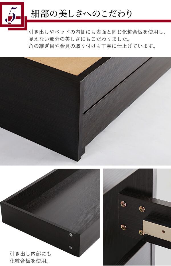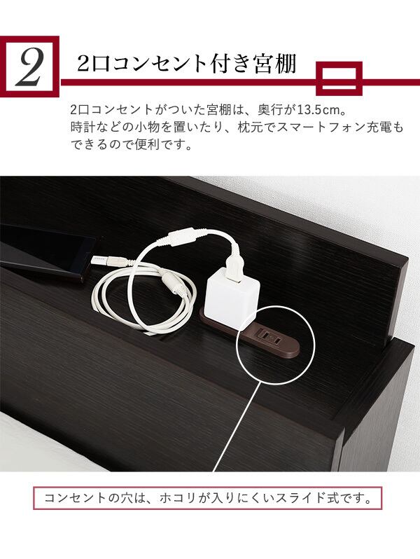 ラグジュアリーな寝室空間を演出するために必要なのは、このデザインベッドフレームのみ。収納付きで機能的、宮棚や2口コンセントで快適。さらに、抗菌・防臭機能も備え、安心してご使用いただけます。高級感漂うブラックオークの木目調がお部屋の雰囲気を一層引き立てます。シングルからダブルサイズまで幅広いサイズ展開で、快適な眠りを演出します。