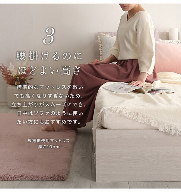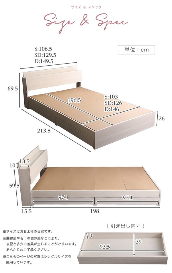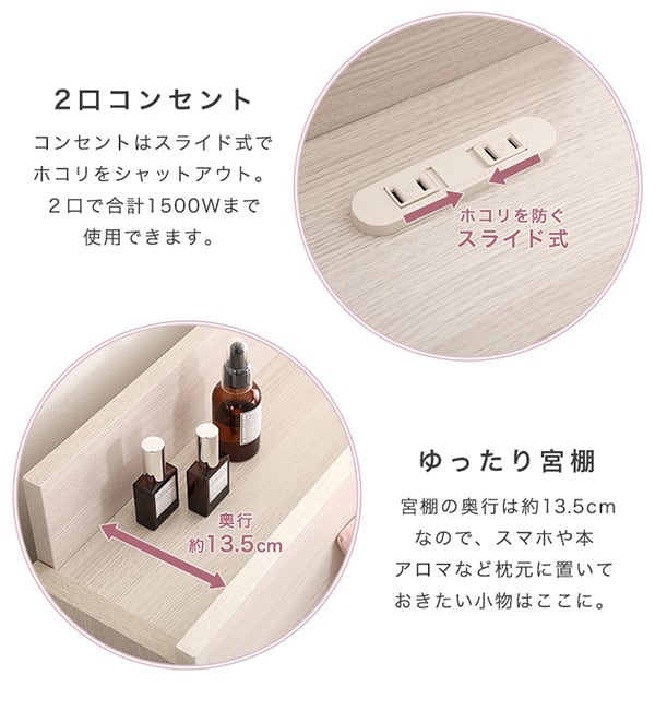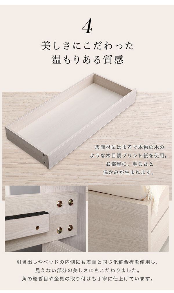 エレガントで機能的な棚とコンセントが付いたアネール/セミダブルサイズのチェストベッドが登場しました。スマートフォンの充電や小物の収納に便利な宮棚付きで、お部屋がスッキリと片付きます。引き出しも付いているので、衣類や寝具などをたっぷり収納することができます。木目調のデザインはお部屋に明るさと温かさを与え、心地よい空間を演出します。