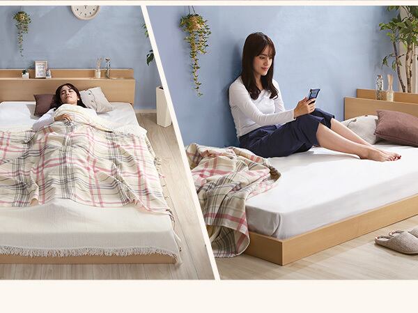 解放感ある空間を演出するデザインフロアベッド、ラニ。シングルサイズで使いやすく、宮棚には2口コンセントも備えているのでスマホやタブレットの充電もラクラク。さらにPVCシートには抗菌・防臭機能が付いているので、いつでも清潔な状態を維持できます。