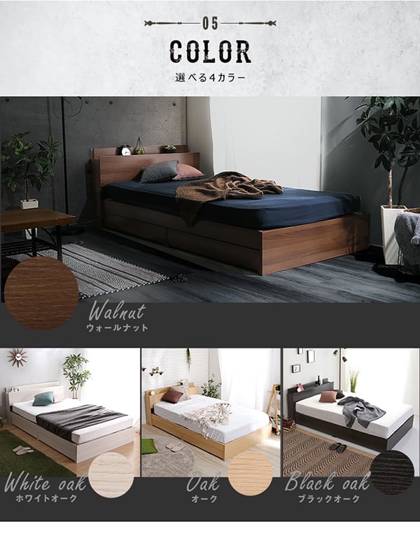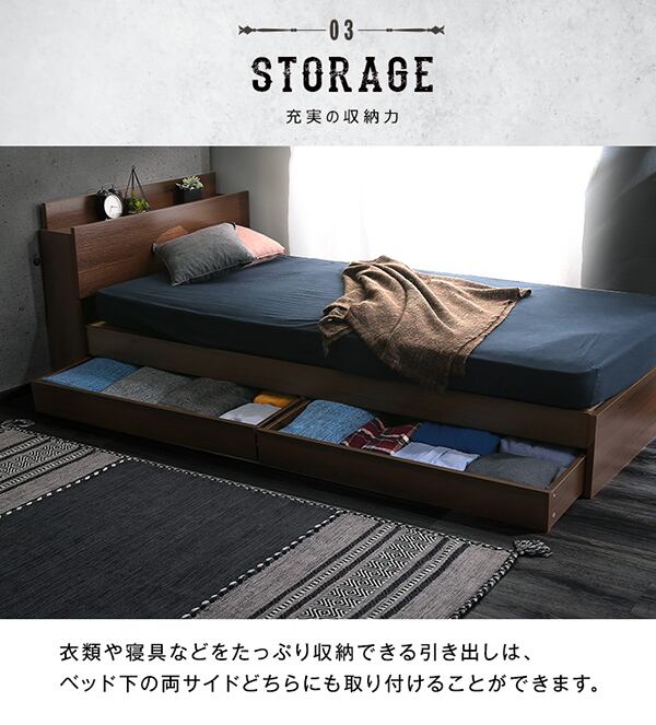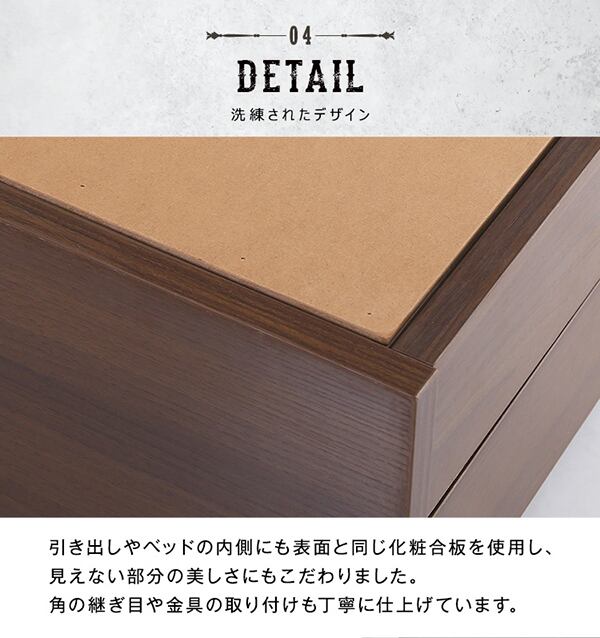 ヴィンテージな雰囲気漂うチェストベッドBROOK。コンパクトながらも十分な収納スペースを確保できるセミダブルサイズは、衣類や寝具、書類などをスッキリ収納できます。また、宮棚や2口コンセントも備え、日常の生活をサポートします。高級感のある色味で、お部屋のインテリアにも馴染みやすく、お部屋を引き締めるアイテムとしても活躍します。