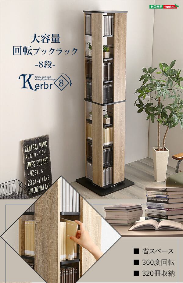 8段に分かれた回転ブックラックで、本やCDをすっきり収納しませんか?Kerbr-ケルブル-の特長は360度回転することでお探しのアイテムがすぐに見つかる便利さ。コンパクトなデザインで、省スペースにも最適です。リビングや書斎に置いて、お部屋のインテリアとしても素敵ですね。