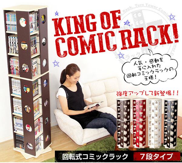 回転する本棚で、コミックやCD、DVDの収納に最適な7段タイプの本棚です!強度アップしたキングオブコミックラックは、くるくると回転して使いやすさも抜群。さらに、カラーは4色展開で、お部屋の雰囲気に合わせて選べます。コミックだけでなく、小物や雑貨も収納可能で、使い勝手が良いのが嬉しいポイントです!コンパクトながらも収納力抜群で、お部屋のスペースを有効活用できます。おしゃれで便利な回転式本棚で、お部屋の模様替えも楽しくなりますよ。ぜひ、お気に入りのアイテムをたっぷり収納してみてください!