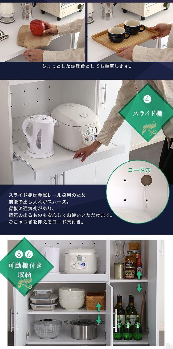 おしゃれなデザインと大容量の収納力で、キッチンをスッキリさせるだけでなく、お部屋のインテリアとしても一層の魅力をプラスしてくれます。使い勝手の良さと美しさを兼ね備えた食器棚で、快適なキッチンライフをお楽しみください。