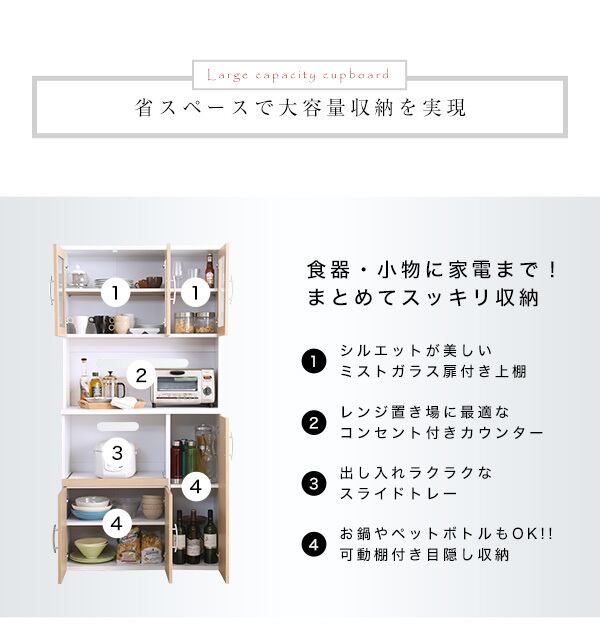 スタイリッシュで木目調のPVC仕上げに、ミストガラスとツートンカラーが相まって、お洒落なキッチン空間を演出する大容量食器棚が登場しました。2口コンセント付きのカウンターやスライドトレーなど、使い勝手も抜群!出し入れもラクラクです。