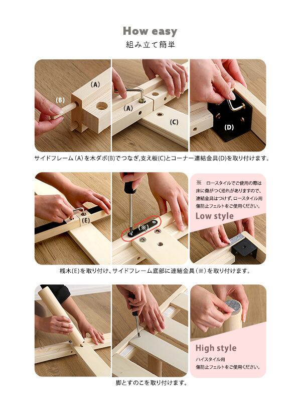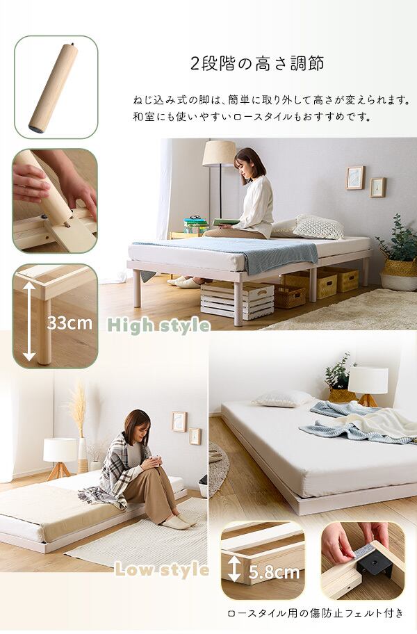 北欧産 パイン材 高さ2段階調整脚付き すのこベッド シングル