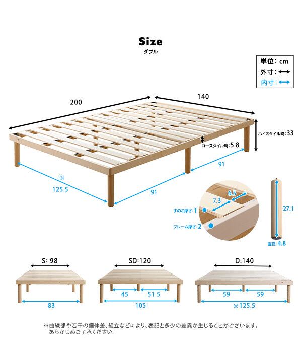 北欧産 パイン材 高さ2段階調整脚付き すのこベッド ダブル