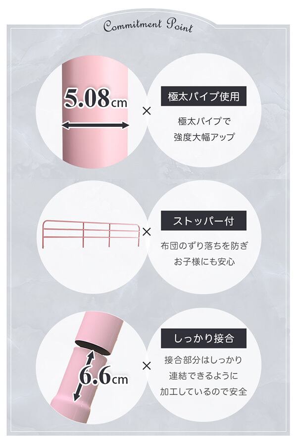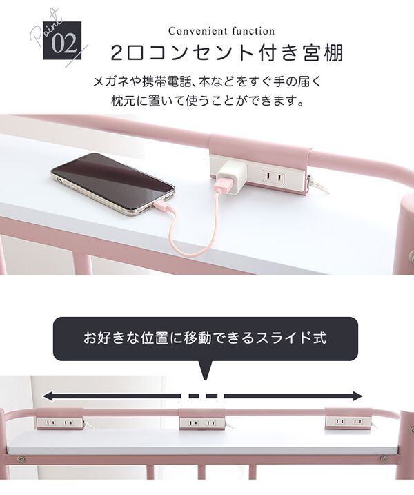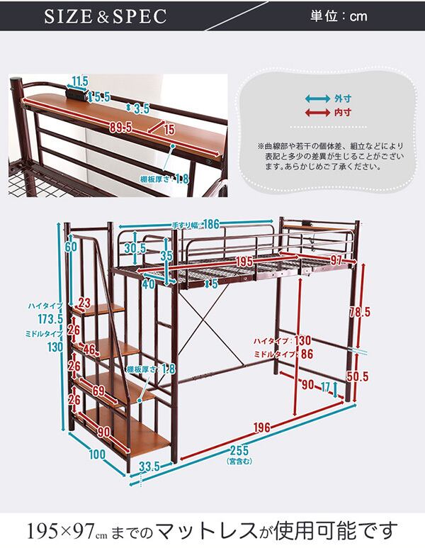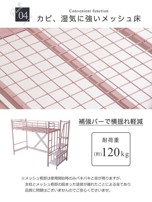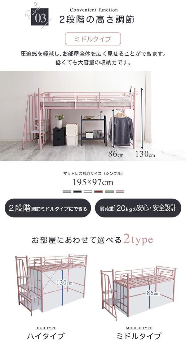 階段付きパイプロフトベッドが登場!ハイタイプ・ミドルタイプに高さ調整可能で、お部屋のレイアウトに合わせて自由自在に使えます。さらに、宮棚・コンセント付きで、お気に入りのアイテムやスマホを手元に置けて便利。安全性もバッチリで、耐荷重120kgの設計なので安心してお使いいただけます。