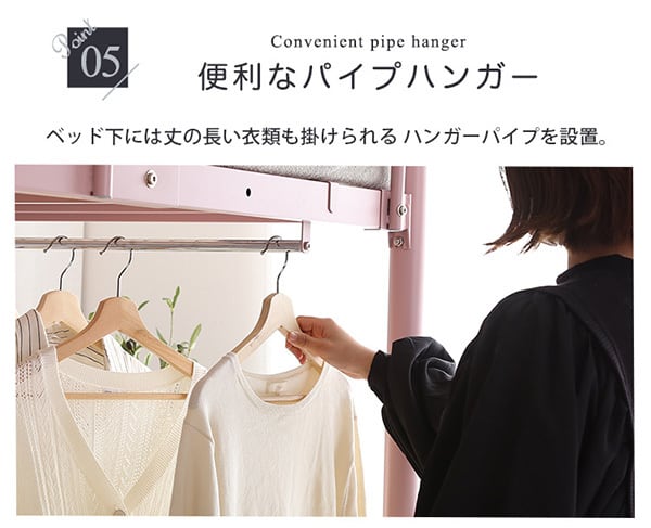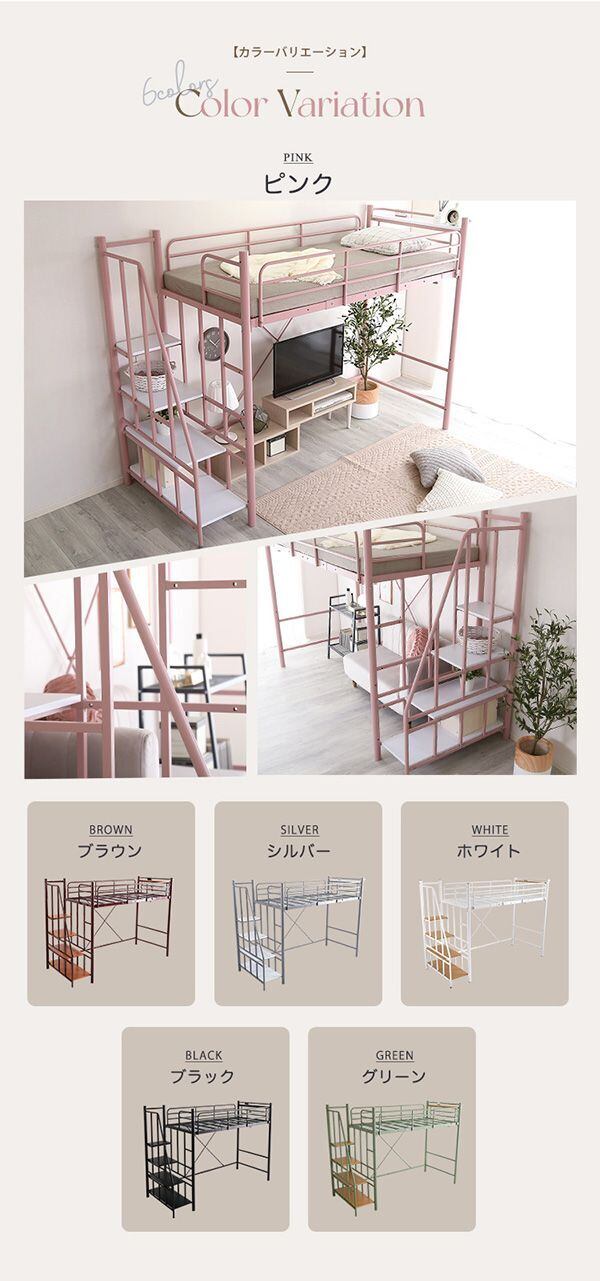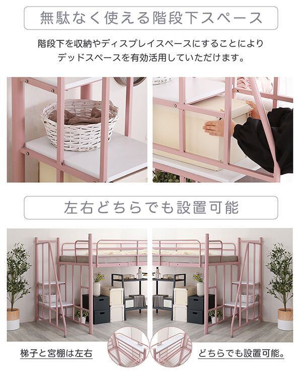 スッキリとしたデザインでお部屋を広々と演出するパイプロフトベッドは、階段付きなので安全に上り下りできます。さらに、階段の設置場所は左右どちらでも選べるので、お部屋のレイアウトにも合わせやすいです。プライベートな空間を創りたい方におすすめのアイテムです。