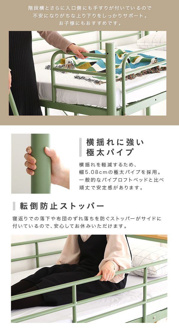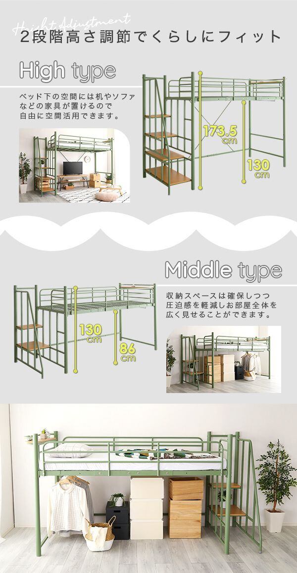 宮棚やコンセントが付いた北欧インテリア、階段付きのパイプロフトベッドが登場しました!ハイタイプ・ミドルタイプに高さ調整可能で階段の設置も左右どちらでも可能です。
