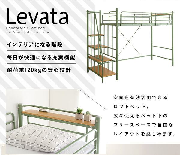 北欧インテリア 宮・コンセント付き 階段付き パイプロフトベッド レヴァタ