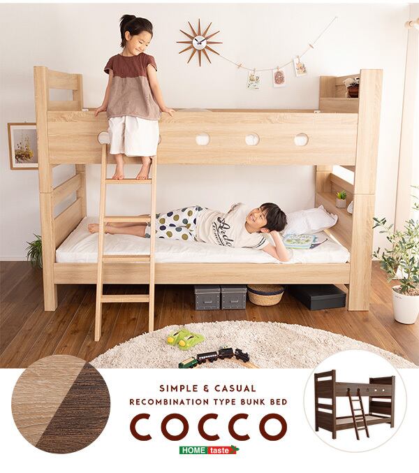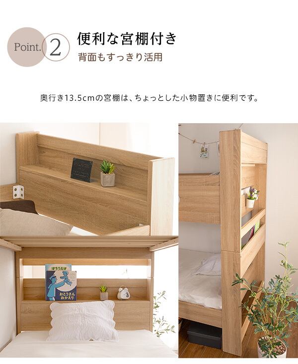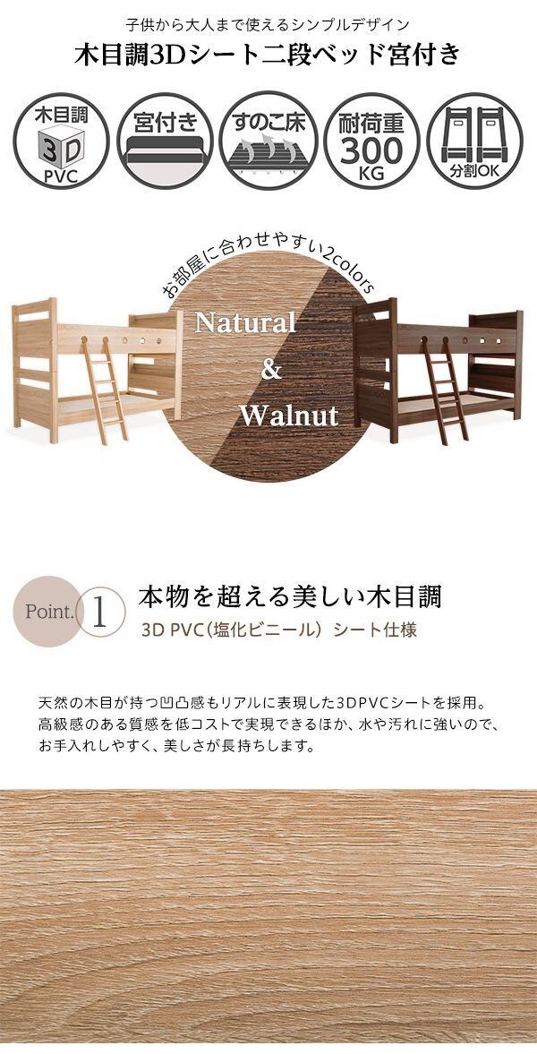 木目調の3DPVCシート仕様の宮付き二段ベッドが登場しました!木目調のナチュラルなデザインがお部屋に温かみを与え上品な雰囲気を演出します。安心のすのこ下の反り止めを3本使用し、耐荷重は約300kgの頑丈設計で安全性も抜群です。さらに、上段下段を離してシングルベッド2台としても使用可能なので、お部屋のレイアウトを自由自在に変えることができます。