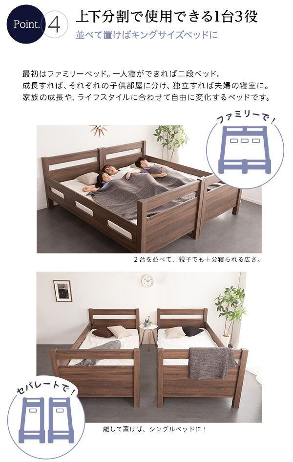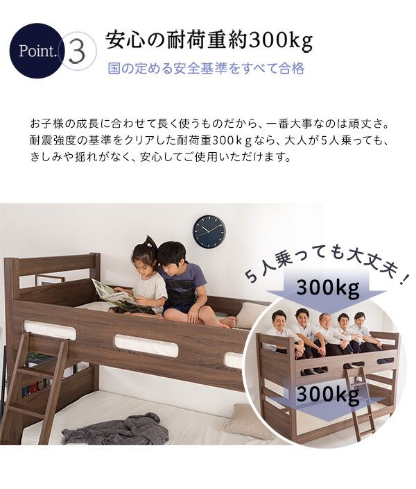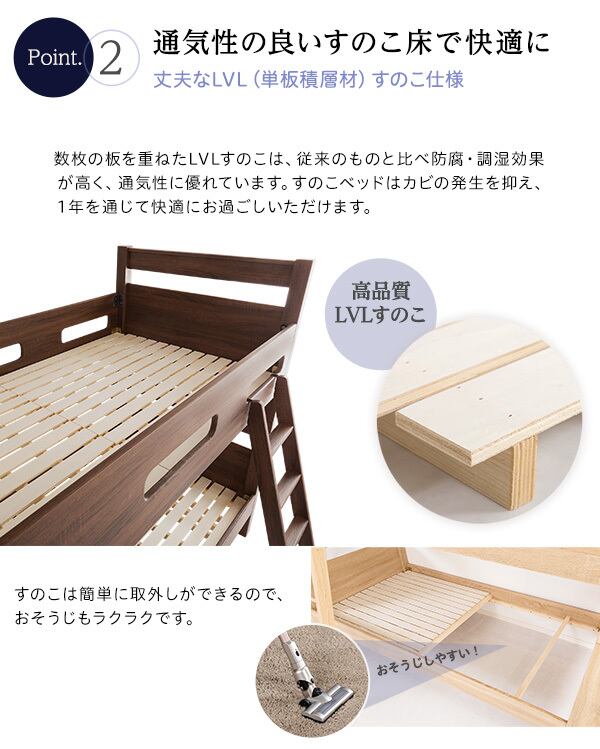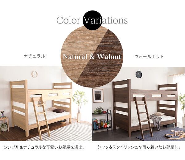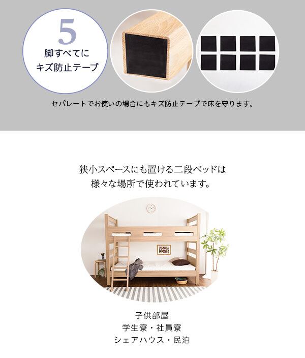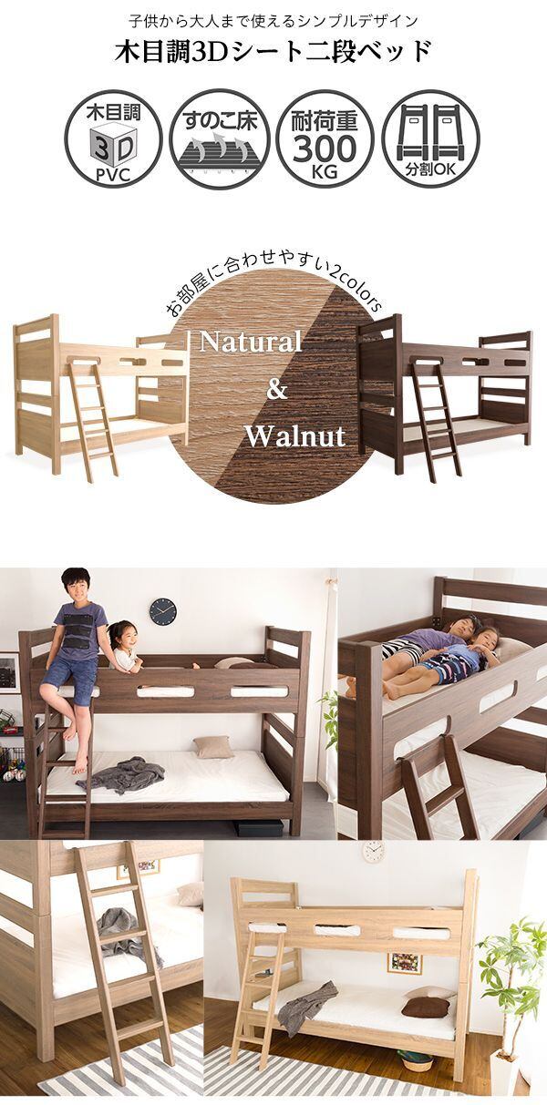 木目調の3DPVCシートを使用した、宮付き二段ベッドが新登場!木目調の質感がナチュラルな雰囲気を醸し出しお部屋に温かみをプラスしてくれます。安定感のあるすのこ下の反り止め構造が安心感を与え、耐荷重約300kgの頑丈設計で長くご使用いただけます。さらに、上段下段を別々に使用することで、シングルベッド2台としてもご利用いただける嬉しい仕様です。