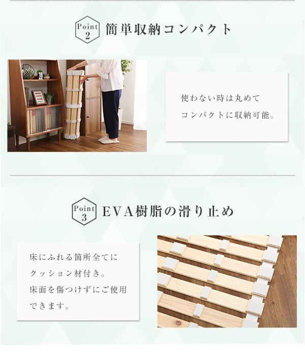通気性バツグンのすのこベッド、ロール式檜仕様シングルが登場しました。最良の檜材を使用したこのベッドは通気性が抜群で寝汗知らず。さらに、180kgの耐荷重を誇り、安心してご利用いただけます。ロール式なので収納場所を取らずに簡単に折りたためます。