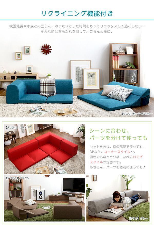 Lantana-ランタナ-のコーナー/ローソファ2セットは、ローテーブルに最適なコーナーローソファのセットです!3つのパーツを自由に組み替え、パーツ毎を固定する接続パーツも付いています。また、洗えるカーバーリングソファでお手入れも簡単!1P、2Pの背もたれを倒せば、ちょうどいい角度に調整可能です。