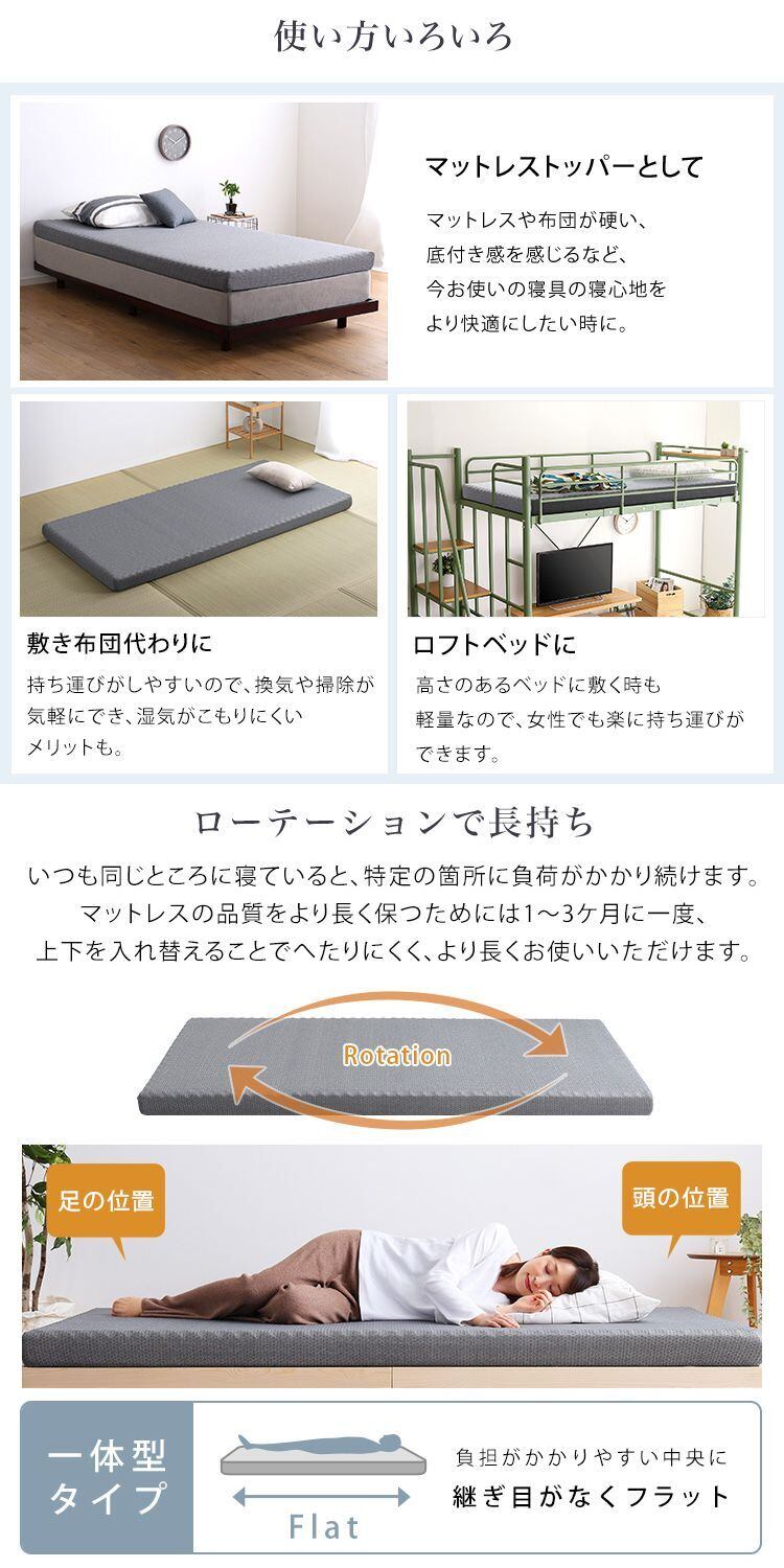 高反発プロファイルウレタンマットレスセミダブルは、快適な睡眠空間を提供するために設計されました。プロファイル加工により、圧力が特定の部位に集中せず、体全体をやさしく支えます。表面は凸凹構造で熱気や湿気が溜まりにくいので、快適な眠りをサポートします。さらに、両面が使用可能なリバーシブルタイプなので、長くご使用いただけます。